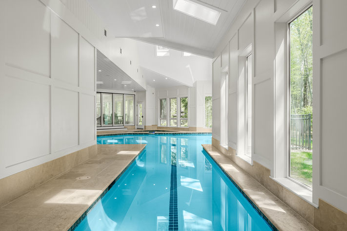 This indoor pool renovation blends indoor comfort with outdoor connection thanks to garage doors that open and provide views out to the backyard. The pool has a lap lane off to the side that allows the pool to be used functionally for exercise as well as leisure. The tall cathedral ceilings and crisp neutral interiors make the space feel fresh, inviting and relaxing for the owners of this oasis.